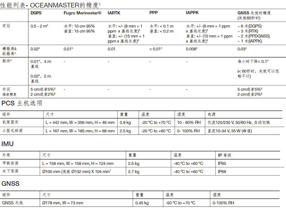 OceanMaster是一款即买即用的综合性船载定位定姿产品,其具有非常友好的用户接口,能够精确地提供船体的姿态、航向、升沉、位置和速度数据。能够提供精确的位置参考和运动补偿,是完成海道测量的专业级产品,姿态系统可基于GNSS系统校准,无需返厂校准。GNSS和惯导融合支持紧耦合算法,当卫星数量小于4颗时,可持续提供导航数据。 系统内GNSS和惯导主机为一体化产品,IMU支持水下安装,IP68等级;可独立应用于多波束、单波束、浅剖等测量设备,支持同时输出姿态、航向、涌浪、位置和速度等数据;惯导可支持GGA、GSV、GST、GSA格式辅助定位数据输入。